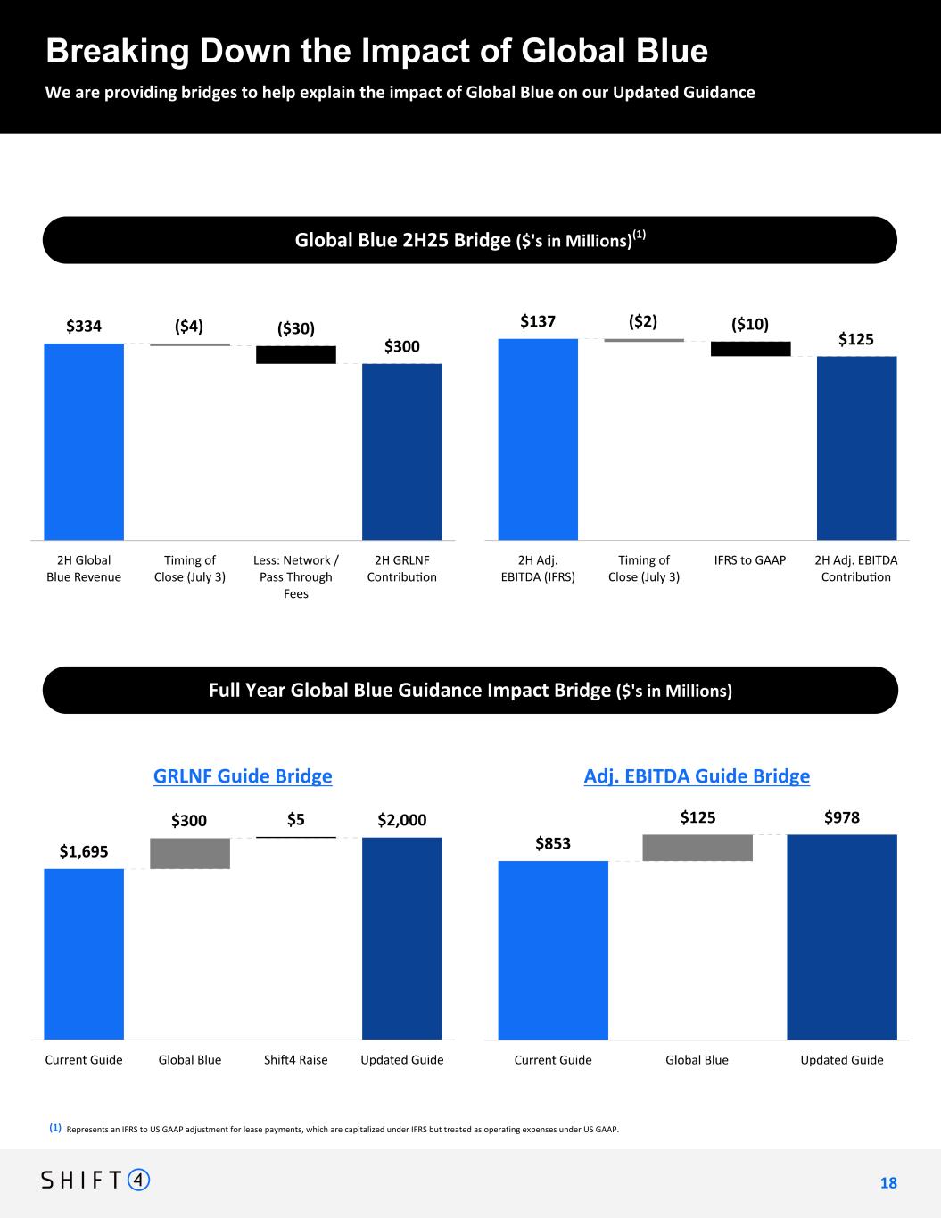 Global Blue 2H25 Bridge ($'s in Millions)(1) Breaking Down the Impact of Global Blue We are providing bridges to help explain the impact of Global Blue on our Updated Guidance 1 8 18 Full Year Global Blue Guidance Impact Bridge ($'s in Millions) GRLNF Guide Bridge Adj. EBITDA Guide Bridge (1) Represents an IFRS to US GAAP adjustment for lease payments, which are capitalized under IFRS but treated as operating expenses under US GAAP.