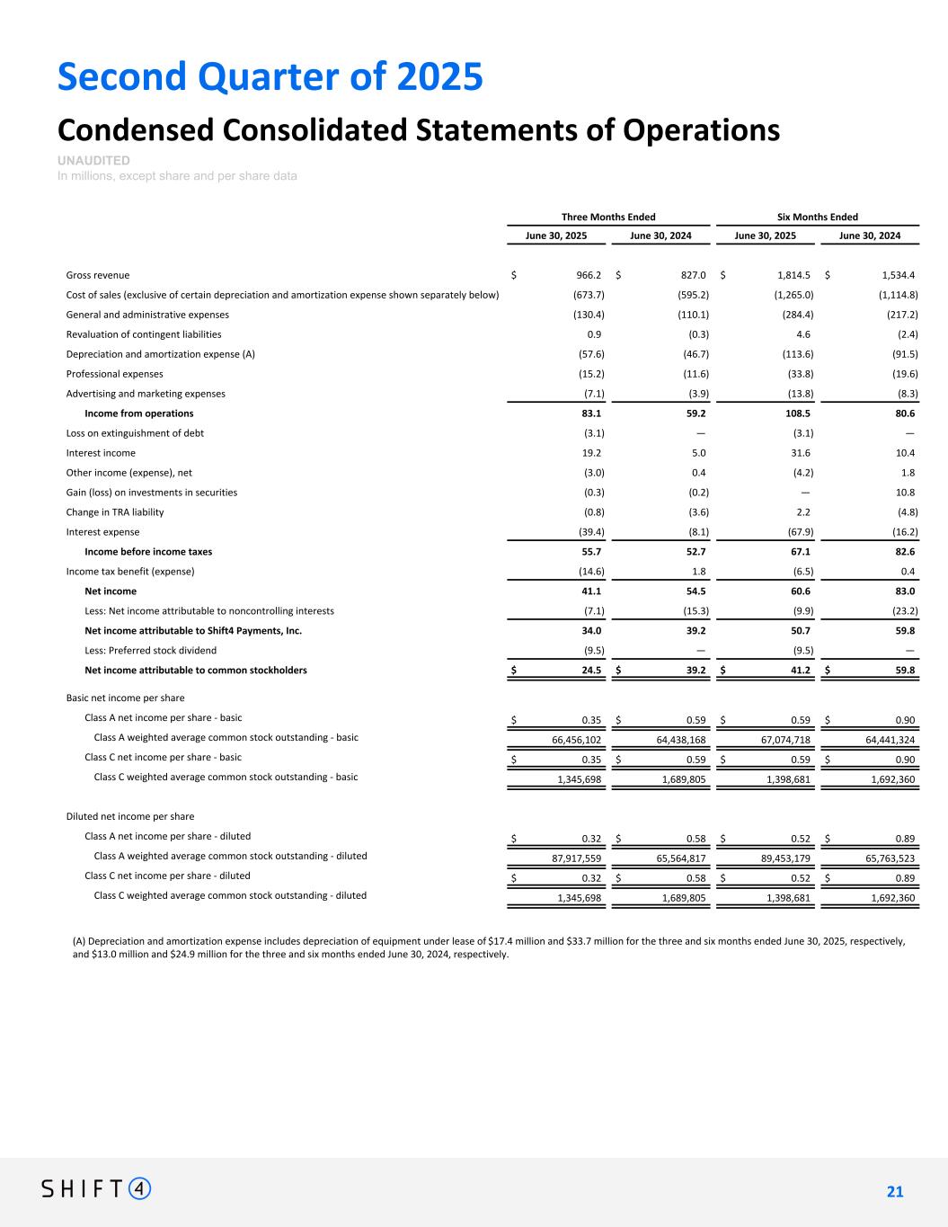 Second Quarter of 2025 Condensed Consolidated Statements of Operations UNAUDITED In millions, except share and per share data Three Months Ended Six Months Ended June 30, 2025 June 30, 2024 June 30, 2025 June 30, 2024 Gross revenue $ 966.2 $ 827.0 $ 1,814.5 $ 1,534.4 Cost of sales (exclusive of certain depreciation and amortization expense shown separately below) (673.7) (595.2) (1,265.0) (1,114.8) General and administrative expenses (130.4) (110.1) (284.4) (217.2) Revaluation of contingent liabilities 0.9 (0.3) 4.6 (2.4) Depreciation and amortization expense (A) (57.6) (46.7) (113.6) (91.5) Professional expenses (15.2) (11.6) (33.8) (19.6) Advertising and marketing expenses (7.1) (3.9) (13.8) (8.3) Income from operations 83.1 59.2 108.5 80.6 Loss on extinguishment of debt (3.1) — (3.1) — Interest income 19.2 5.0 31.6 10.4 Other income (expense), net (3.0) 0.4 (4.2) 1.8 Gain (loss) on investments in securities (0.3) (0.2) — 10.8 Change in TRA liability (0.8) (3.6) 2.2 (4.8) Interest expense (39.4) (8.1) (67.9) (16.2) Income before income taxes 55.7 52.7 67.1 82.6 Income tax benefit (expense) (14.6) 1.8 (6.5) 0.4 Net income 41.1 54.5 60.6 83.0 Less: Net income attributable to noncontrolling interests (7.1) (15.3) (9.9) (23.2) Net income attributable to Shift4 Payments, Inc. 34.0 39.2 50.7 59.8 Less: Preferred stock dividend (9.5) — (9.5) — Net income attributable to common stockholders $ 24.5 $ 39.2 $ 41.2 $ 59.8 Basic net income per share Class A net income per share - basic $ 0.35 $ 0.59 $ 0.59 $ 0.90 Class A weighted average common stock outstanding - basic 66,456,102 64,438,168 67,074,718 64,441,324 Class C net income per share - basic $ 0.35 $ 0.59 $ 0.59 $ 0.90 Class C weighted average common stock outstanding - basic 1,345,698 1,689,805 1,398,681 1,692,360 Diluted net income per share Class A net income per share - diluted $ 0.32 $ 0.58 $ 0.52 $ 0.89 Class A weighted average common stock outstanding - diluted 87,917,559 65,564,817 89,453,179 65,763,523 Class C net income per share - diluted $ 0.32 $ 0.58 $ 0.52 $ 0.89 Class C weighted average common stock outstanding - diluted 1,345,698 1,689,805 1,398,681 1,692,360 (A) Depreciation and amortization expense includes depreciation of equipment under lease of $17.4 million and $33.7 million for the three and six months ended June 30, 2025, respectively, and $13.0 million and $24.9 million for the three and six months ended June 30, 2024, respectively. 2 1 21