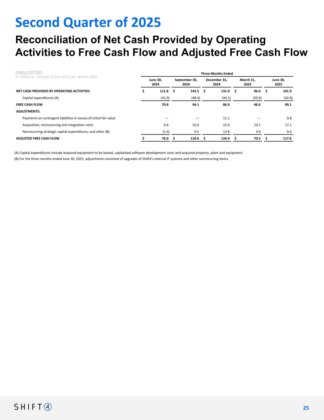 Three Months Ended June 30, 2024 September 30, 2024 December 31, 2024 March 31, 2025 June 30, 2025 NET CASH PROVIDED BY OPERATING ACTIVITIES $ 111.8 $ 142.5 $ 131.0 $ 96.6 $ 141.9 Capital expenditures (A) (41.0) (48.4) (44.1) (50.0) (42.8) FREE CASH FLOW 70.8 94.1 86.9 46.6 99.1 ADJUSTMENTS: Payments on contingent liabilities in excess of initial fair value — — 11.1 — 0.8 Acquisition, restructuring and integration costs 6.6 16.0 22.6 19.1 17.1 Nonrecurring strategic capital expenditures, and other (B) (1.4) 0.5 13.8 4.8 0.6 ADJUSTED FREE CASH FLOW $ 76.0 $ 110.6 $ 134.4 $ 70.5 $ 117.6 Reconciliation of Net Cash Provided by Operating Activities to Free Cash Flow and Adjusted Free Cash Flow UNAUDITED In millions, except share and per share data Second Quarter of 2025 (A) Capital expenditures include acquired equipment to be leased, capitalized software development costs and acquired property, plant and equipment. (B) For the three months ended June 30, 2025, adjustments consisted of upgrades of Shift4's internal IT systems and other nonrecurring items. 2 5 25