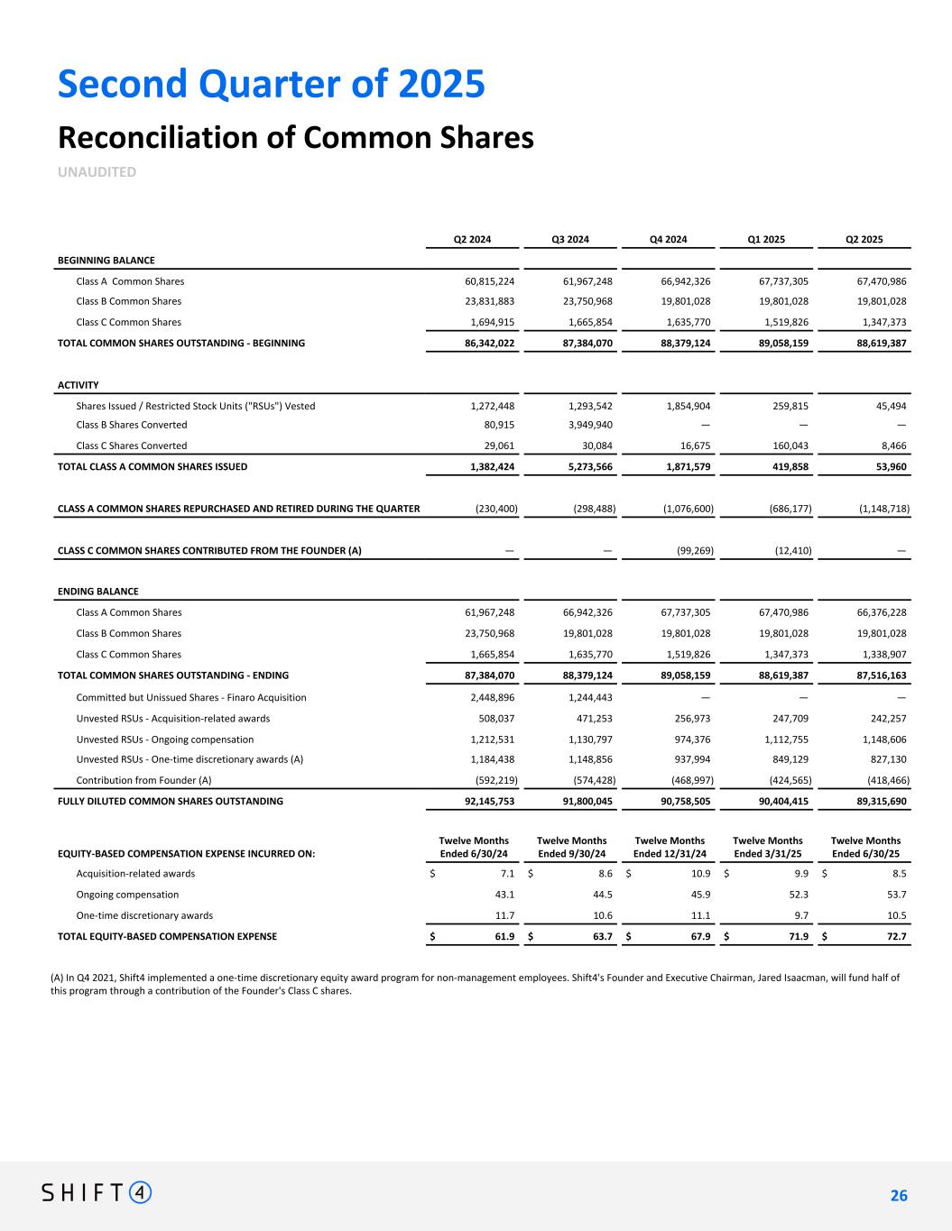 (A) In Q4 2021, Shift4 implemented a one-time discretionary equity award program for non-management employees. Shift4's Founder and Executive Chairman, Jared Isaacman, will fund half of this program through a contribution of the Founder's Class C shares. Second Quarter of 2025 Reconciliation of Common Shares UNAUDITED Q2 2024 Q3 2024 Q4 2024 Q1 2025 Q2 2025 BEGINNING BALANCE Class A Common Shares 60,815,224 61,967,248 66,942,326 67,737,305 67,470,986 Class B Common Shares 23,831,883 23,750,968 19,801,028 19,801,028 19,801,028 Class C Common Shares 1,694,915 1,665,854 1,635,770 1,519,826 1,347,373 TOTAL COMMON SHARES OUTSTANDING - BEGINNING 86,342,022 87,384,070 88,379,124 89,058,159 88,619,387 ACTIVITY Shares Issued / Restricted Stock Units ("RSUs") Vested 1,272,448 1,293,542 1,854,904 259,815 45,494 Class B Shares Converted 80,915 3,949,940 — — — Class C Shares Converted 29,061 30,084 16,675 160,043 8,466 TOTAL CLASS A COMMON SHARES ISSUED 1,382,424 5,273,566 1,871,579 419,858 53,960 CLASS A COMMON SHARES REPURCHASED AND RETIRED DURING THE QUARTER (230,400) (298,488) (1,076,600) (686,177) (1,148,718) CLASS C COMMON SHARES CONTRIBUTED FROM THE FOUNDER (A) — — (99,269) (12,410) — ENDING BALANCE Class A Common Shares 61,967,248 66,942,326 67,737,305 67,470,986 66,376,228 Class B Common Shares 23,750,968 19,801,028 19,801,028 19,801,028 19,801,028 Class C Common Shares 1,665,854 1,635,770 1,519,826 1,347,373 1,338,907 TOTAL COMMON SHARES OUTSTANDING - ENDING 87,384,070 88,379,124 89,058,159 88,619,387 87,516,163 Committed but Unissued Shares - Finaro Acquisition 2,448,896 1,244,443 — — — Unvested RSUs - Acquisition-related awards 508,037 471,253 256,973 247,709 242,257 Unvested RSUs - Ongoing compensation 1,212,531 1,130,797 974,376 1,112,755 1,148,606 Unvested RSUs - One-time discretionary awards (A) 1,184,438 1,148,856 937,994 849,129 827,130 Contribution from Founder (A) (592,219) (574,428) (468,997) (424,565) (418,466) FULLY DILUTED COMMON SHARES OUTSTANDING 92,145,753 91,800,045 90,758,505 90,404,415 89,315,690 EQUITY-BASED COMPENSATION EXPENSE INCURRED ON: Twelve Months Ended 6/30/24 Twelve Months Ended 9/30/24 Twelve Months Ended 12/31/24 Twelve Months Ended 3/31/25 Twelve Months Ended 6/30/25 Acquisition-related awards $ 7.1 $ 8.6 $ 10.9 $ 9.9 $ 8.5 Ongoing compensation 43.1 44.5 45.9 52.3 53.7 One-time discretionary awards 11.7 10.6 11.1 9.7 10.5 TOTAL EQUITY-BASED COMPENSATION EXPENSE $ 61.9 $ 63.7 $ 67.9 $ 71.9 $ 72.7 2 6 26