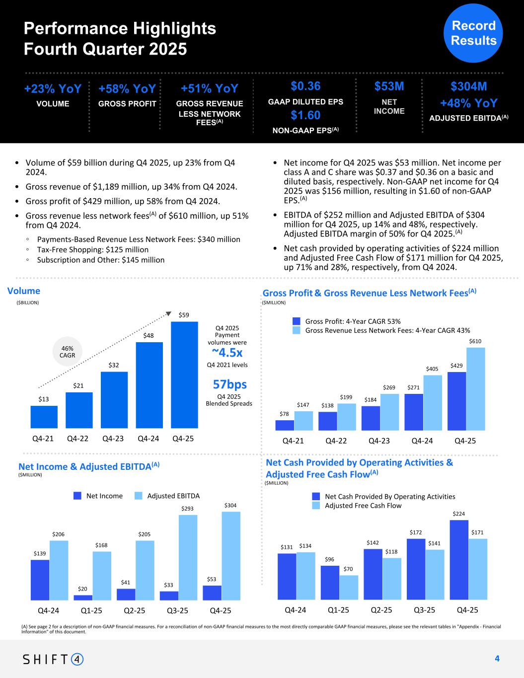 (A) In Q4 2021, Shift4 implemented a one-time discretionary equity award program for non-management employees. Shift4's Founder and Executive Chairman, Jared Isaacman, had committed to fund half of this program through a contribution of his Class C shares. In February 2026, in connection with the Simplification Transaction, Shift4 negotiated the termination of the Founder's remaining commitment to contribute 50% of this program. (B) Excludes 10 million shares of Mandatory Convertible Preferred Stock. Fourth Quarter of 2025 Reconciliation of Common Shares UNAUDITED Q4 2024 Q1 2025 Q2 2025 Q3 2025 Q4 2025 BEGINNING BALANCE Class A Common Shares 66,942,326 67,737,305 67,470,986 66,376,228 67,451,984 Class B Common Shares 19,801,028 19,801,028 19,801,028 19,801,028 19,801,028 Class C Common Shares 1,635,770 1,519,826 1,347,373 1,338,907 1,253,566 TOTAL COMMON SHARES OUTSTANDING - BEGINNING 88,379,124 89,058,159 88,619,387 87,516,163 88,506,578 ACTIVITY Shares Issued / Restricted Stock Units ("RSUs") Vested 1,854,904 259,815 45,494 990,415 434,188 Class C Shares Converted 16,675 160,043 8,466 85,341 130,257 TOTAL CLASS A COMMON SHARES ISSUED 1,871,579 419,858 53,960 1,075,756 564,445 CLASS A COMMON SHARES REPURCHASED AND RETIRED DURING THE QUARTER (1,076,600) (686,177) (1,148,718) — (4,349,592) CLASS C COMMON SHARES CONTRIBUTED FROM THE FOUNDER (A) (99,269) (12,410) — — — ENDING BALANCE Class A Common Shares 67,737,305 67,470,986 66,376,228 67,451,984 63,666,837 Class B Common Shares 19,801,028 19,801,028 19,801,028 19,801,028 19,801,028 Class C Common Shares 1,519,826 1,347,373 1,338,907 1,253,566 1,123,309 TOTAL COMMON SHARES OUTSTANDING - ENDING 89,058,159 88,619,387 87,516,163 88,506,578 84,591,174 Unvested RSUs - Acquisition-related awards 256,973 247,709 242,257 381,174 260,157 Unvested RSUs - Ongoing compensation 974,376 1,112,755 1,148,606 1,263,848 1,169,933 Unvested RSUs - One-time discretionary awards (A) 937,994 849,129 827,130 784,110 510,346 Contribution from Founder (A) (468,997) (424,565) (418,466) (412,759) — FULLY DILUTED COMMON SHARES OUTSTANDING (B) 90,758,505 90,404,415 89,315,690 90,522,951 86,531,610 EQUITY-BASED COMPENSATION EXPENSE AND RELATED PAYROLL TAX INCURRED ON: Twelve Months Ended 12/31/24 Twelve Months Ended 3/31/25 Twelve Months Ended 6/30/25 Twelve Months Ended 9/30/25 Twelve Months Ended 12/31/25 Acquisition-related awards $ 11 $ 10 $ 8 $ 7 $ 8 Ongoing compensation 46 52 54 56 66 One-time discretionary awards 11 10 11 11 11 TOTAL EQUITY-BASED COMPENSATION EXPENSE AND RELATED PAYROLL TAX $ 68 $ 72 $ 73 $ 74 $ 85 2 2 22 Q4 2024 Q1 2025 Q2 2025 Q3 2025 Q4 2025 WEIGHTED AVERAGE SHARE COUNT - GAAP DILUTED EPS 93 92 89 91 67 Weighted average anti-dilutive LLC Interests (Class B shares) — — — — 20 Mandatory Convertible Preferred Stock - Shares outstanding at period-end — — 10 10 10 SHARE COUNT - NON-GAAP EPS 93 92 99 101 97